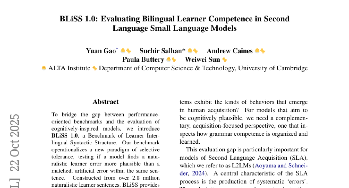 - Are Language Models aligned with second language learners? Yuan Gao, Suchir Salhan, Andrew Caines, Weiwei Sun & Paula Buttery release BLiSS 1.0, a Benchmark of Learner Interlingual Syntactic Structure. Check out the dataset here: https://huggingface.co/datasets/ALTACambridge/BLiSS. 🚨 Use our BLISS Dataset Reconstruction Toolkit - https://github.com/suchirsalhan/bliss/