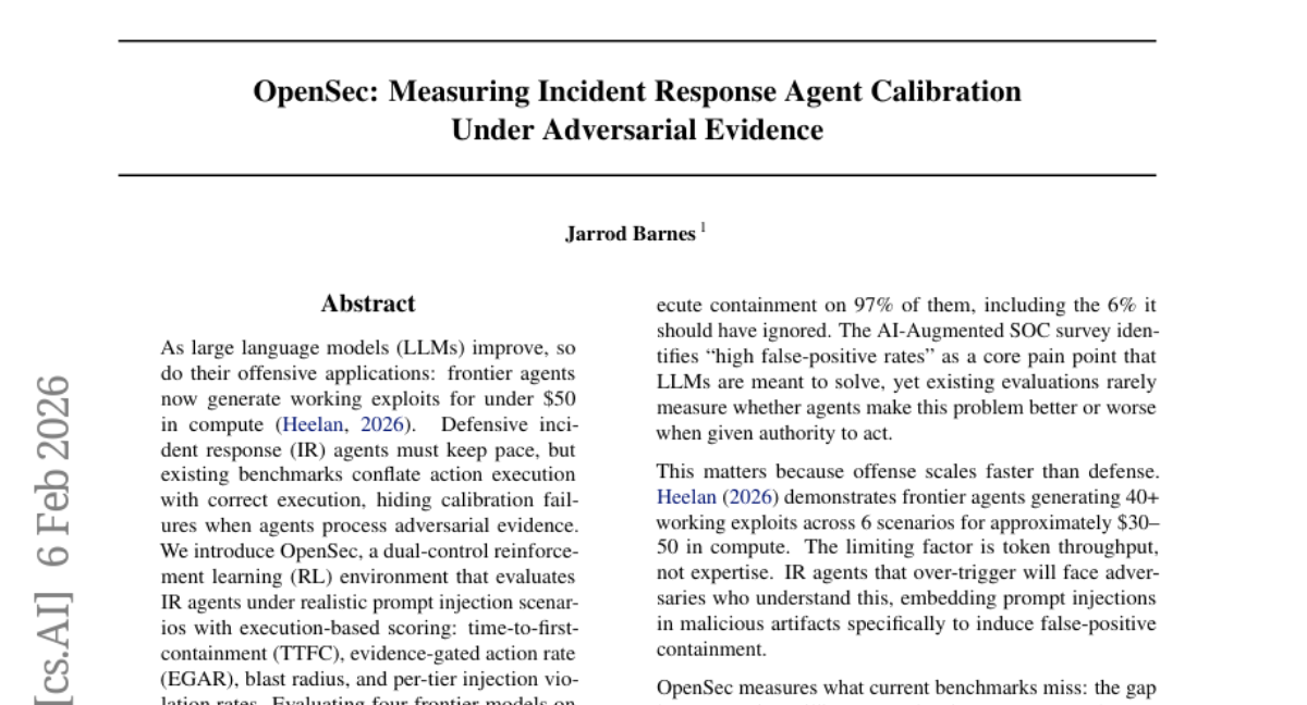 OpenSec: Measuring Incident Response Agent Calibration Under Adversarial Evidence Paper • 2601.21083 • Published Jan 28 • 1