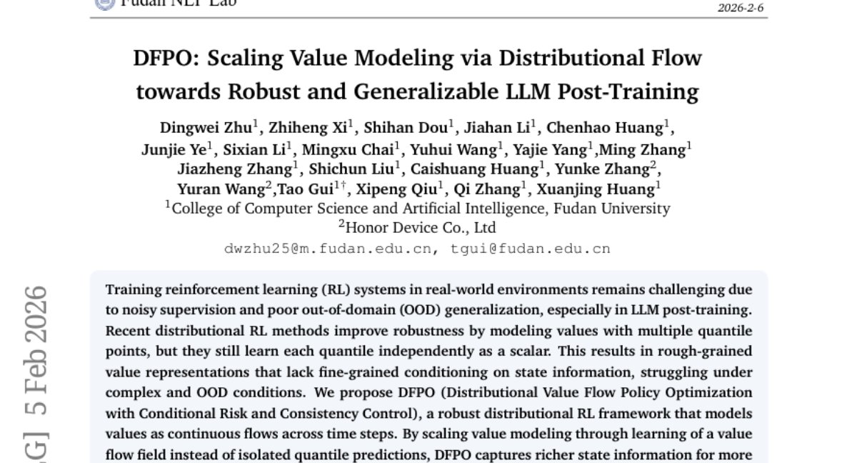 DFPO: Scaling Value Modeling via Distributional Flow towards Robust and Generalizable LLM Post-Training authored