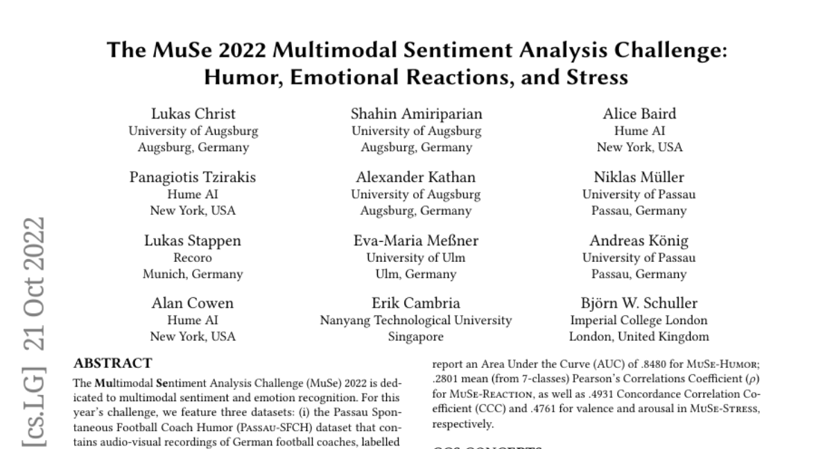 The MuSe 2022 Multimodal Sentiment Analysis Challenge: Humor, Emotional Reactions, and Stress authored a paper 5 days ago