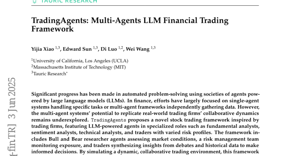 A multi-agent framework using large language models for stock trading simulates real-world trading firms, improving performance metrics like cumulative returns and Sharpe ratio.