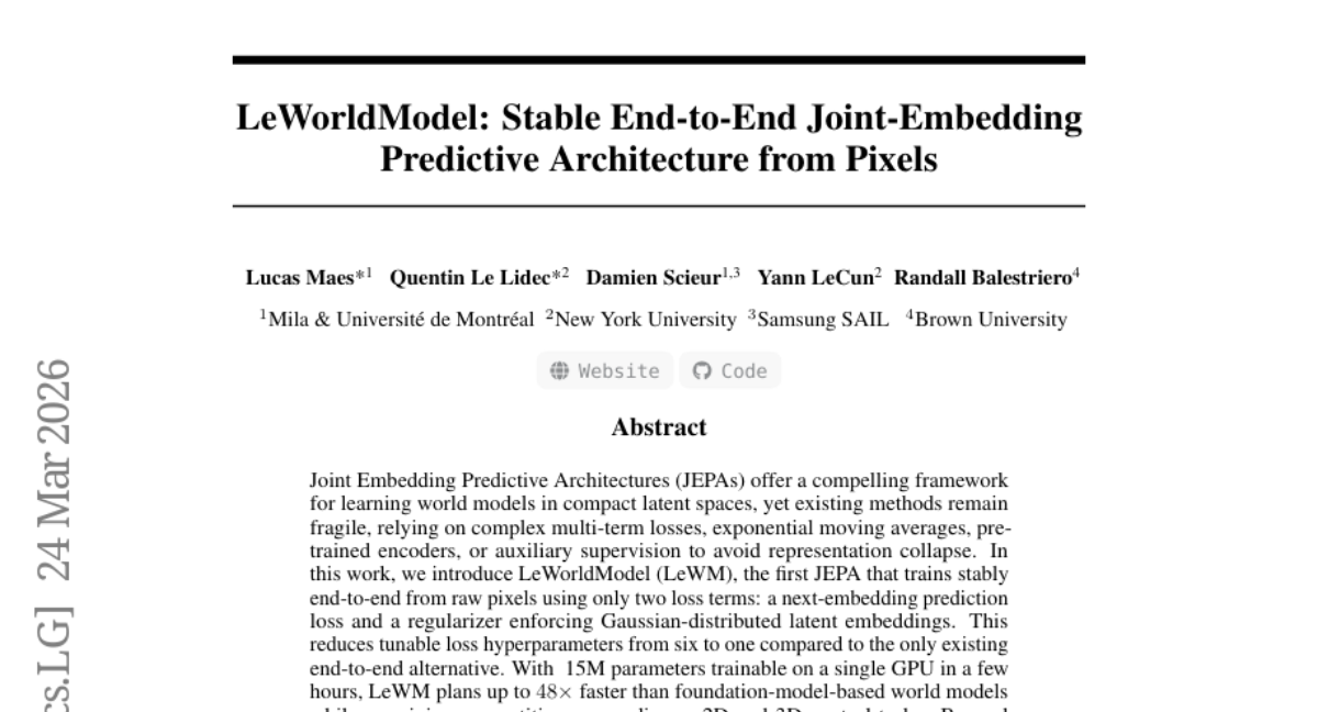 LeWorldModel presents a stable end-to-end JEPA framework that trains efficiently from raw pixels using minimal loss terms while maintaining competitive performance in control tasks and encoding meaningful physical structures.